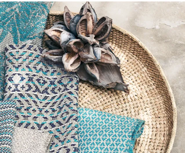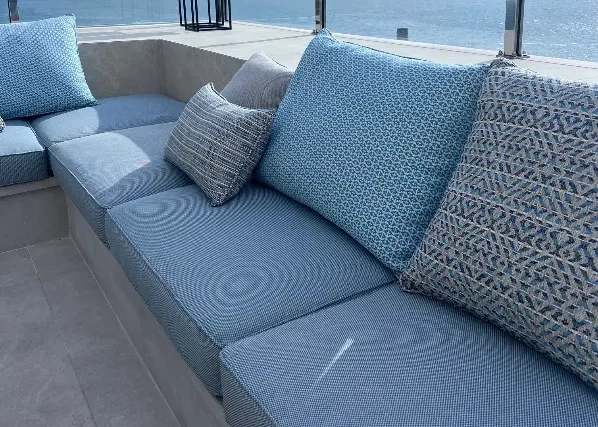 Für die Bezüge kamen ausschließlich Stoffe von ROMO zum Einsatz. Dekorative Wellendesigns und faux-uni Muster prägen diese wunderschöne Sitzlandschaft und fügen sich in die Umgebung ein.