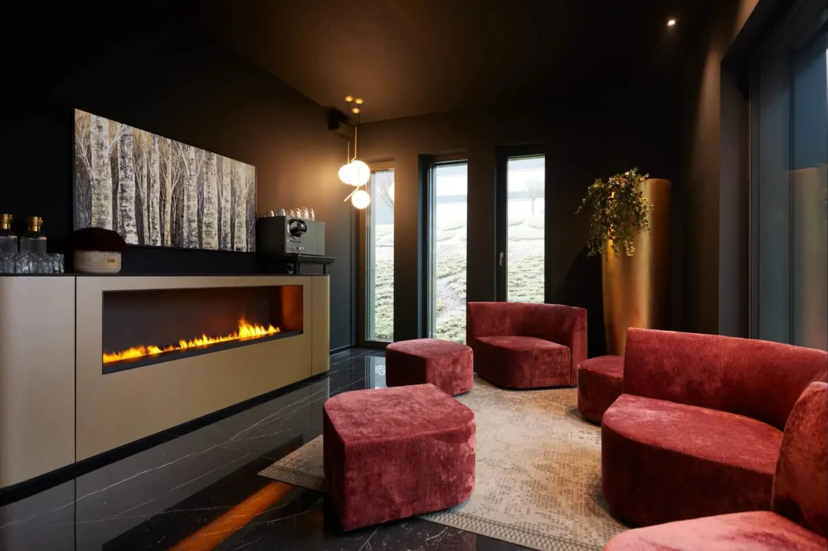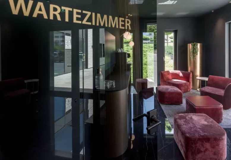 Hier sitzt man bequem und warm in einer Wartelounge als wäre man in einer Bar. Unsere Sofaserie MOTU durfte hier im Wartezimmer einziehen und steht für kleine und große Patienten bereit. Das warme Rot des Stoffbezugs passt hervorragend zu den dunkel gehaltenen Wänden mit goldenen Akzenten.